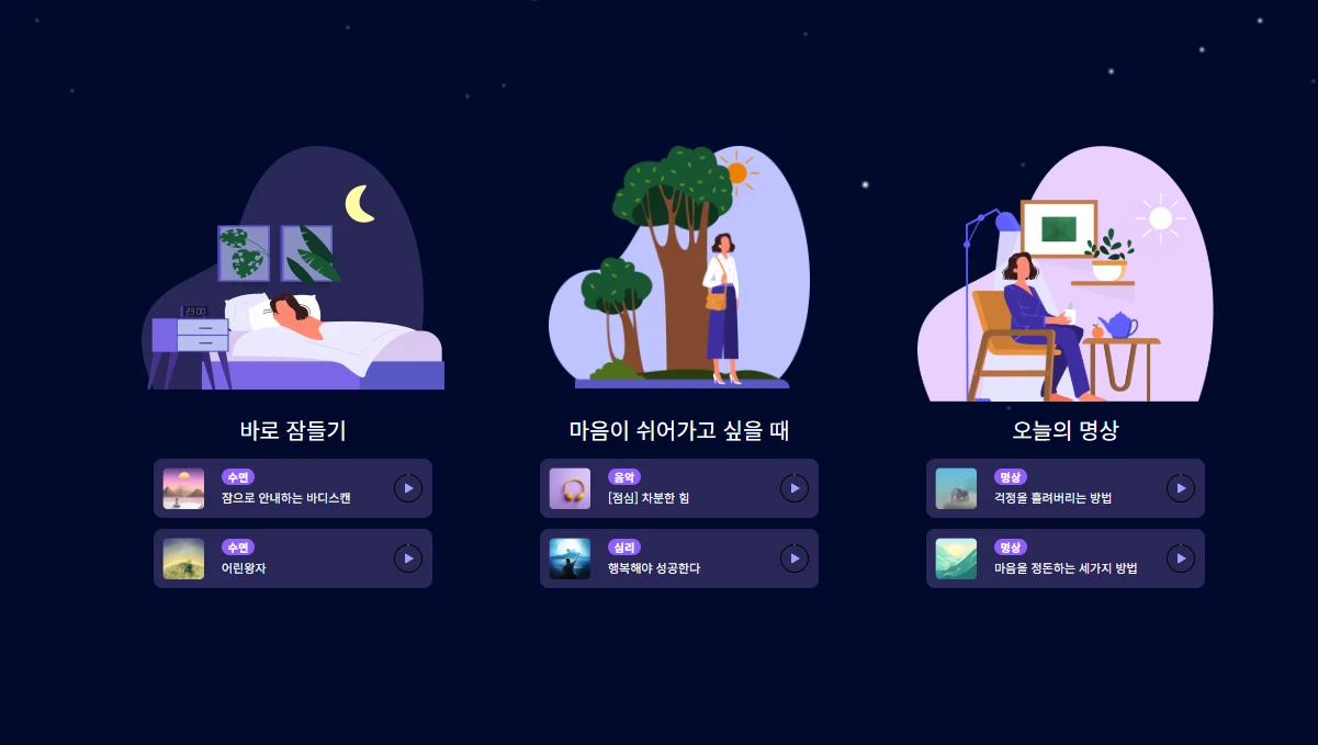 한국어 명상 콘텐츠에 최적화된 감정 안정 & 수면 유도 앱